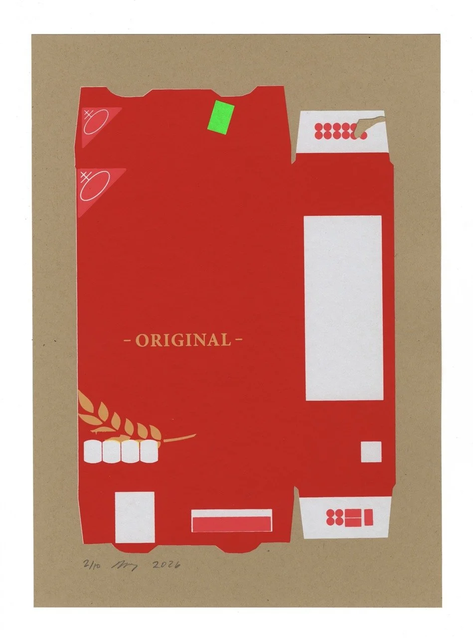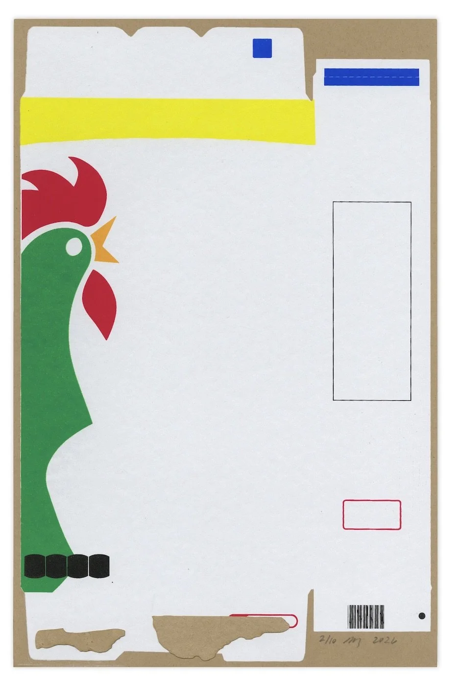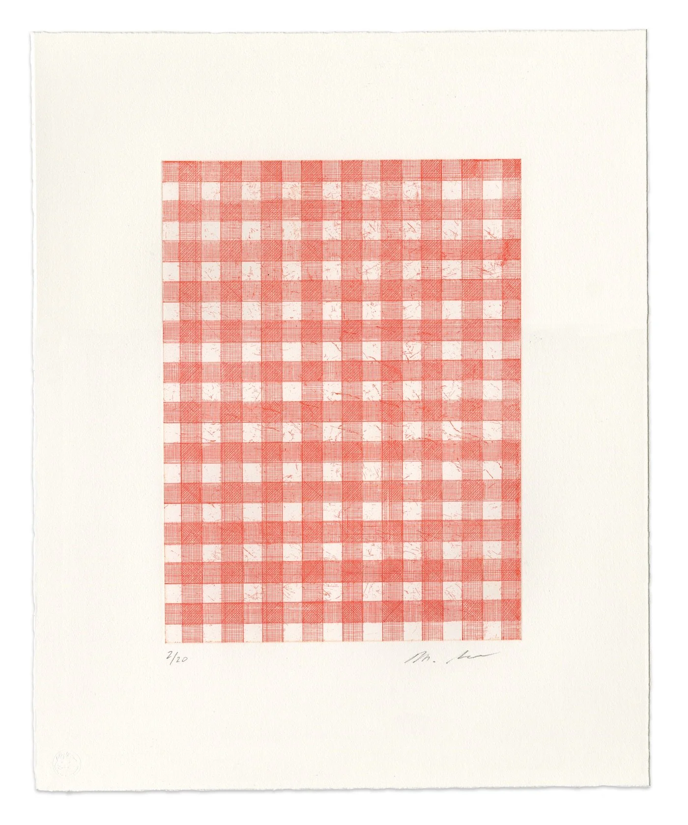 During her short residency with the Neiman Center in the winter of 2025, Michelle Grabner made a series of screenprints based on cereal and snack boxes found at the local grocery store. Grabner’s flattened boxes possess a Pop Art spirit; however, she purposefully removed the familiar signs and symbols of their branding to focus on their vibrant color and abstract form. Inspired by common objects and everyday textiles, Grabner seeks out repetitive patterns, shapes and forms that she meticulously works and reworks in her paintings, drawings, sculptures and prints. In addition to her screenprints, Grabner also made an etching of a familiar gingham textile yet, in her hands, the prosaic pattern is transformed into a lively, meditative abstraction.