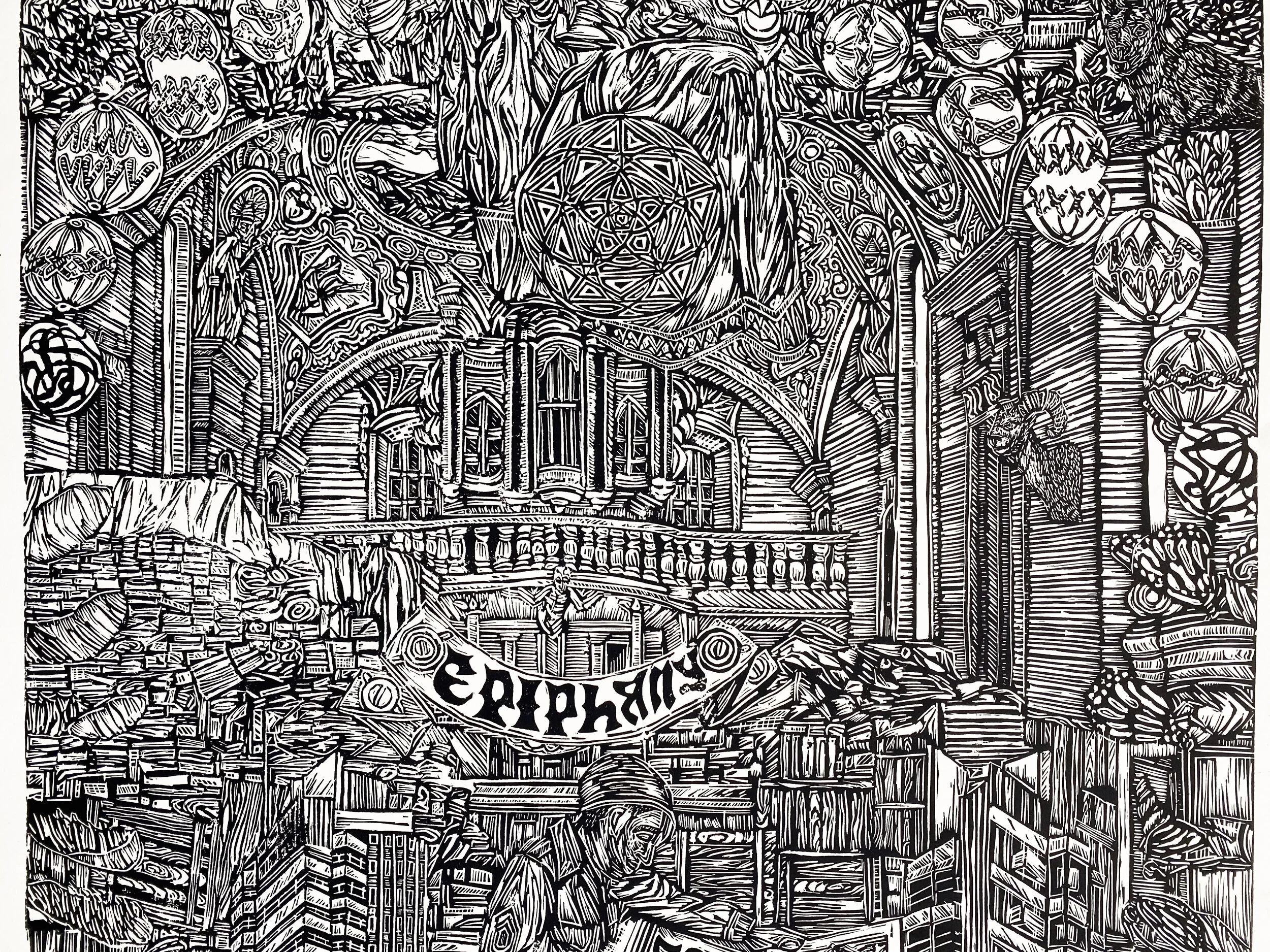 Epiphany is the first print in a six print series which explores generally the stages that a cycle or process goes through in its development. All pieces in the series connect together thematically and with shared visual content at the sides top and bottom forming a larger gestalt piece of 9’x12’ or larger. This is an artist proof as the entire series is soon to be printed in edition.