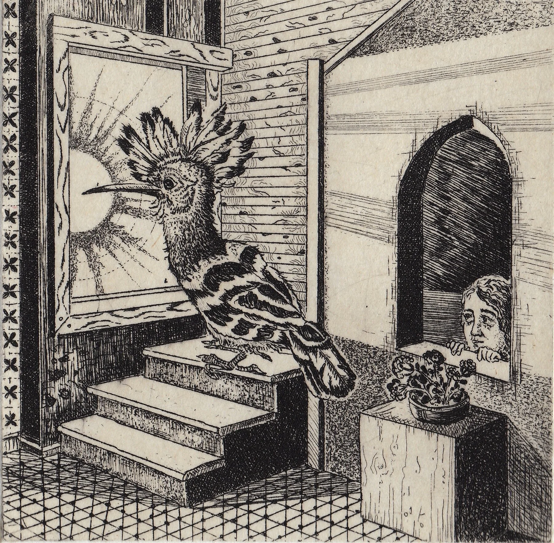 “In my recent work I’ve been developing a body of miniature etchings often presented in an installation format with murals specifically created for each piece. My unorthodox narratives have an autobiographical approach. The compositions and imagery are inspired by the manuscripts of the 16th and 17th century in Iran. Hoopoe, a significant leading bird from Attar’s book of The Conference of The Birds, is a reoccurring figure in my images. The Hoopoe was a messenger of unity. I’m calling on Hoopoe to make a comeback and offer its wisdom to our divided world. There’s an indisputable perfection in the execution of the manuscripts. My effort in the transplantation of the patterns, poetry and imagery aims to create an interweaving conversation between all of the pieces that traditionally stand alone in the manuscript.“
