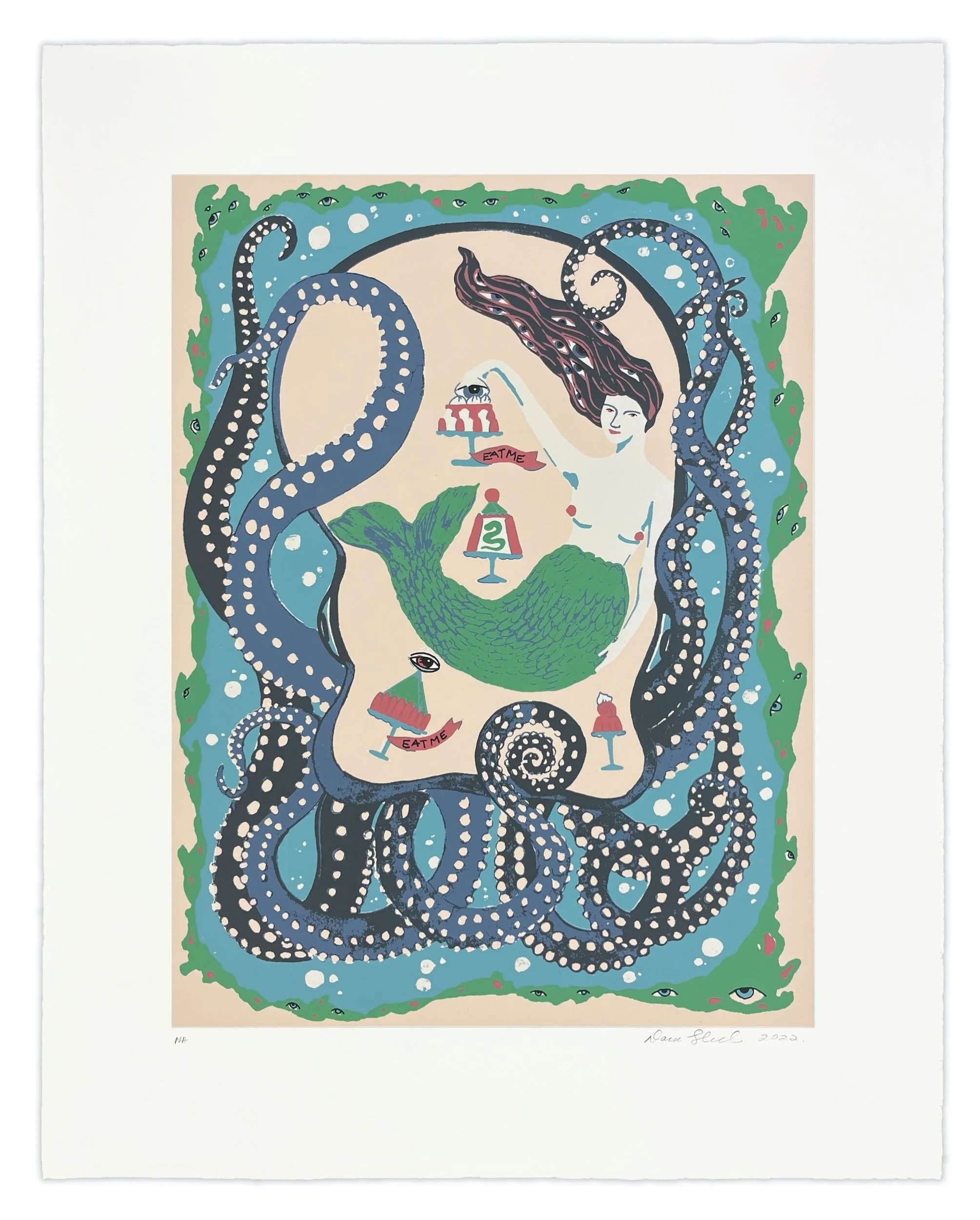 Dana Sherwood is a multimedia artist focused on the relationship between humans and the natural world. She stages banquets of tempting treats in the landscape as a way to attract animals and film them feasting on night vision video cameras. These videos reflect the effects of human encroachment on nature and capture Sherwood’s interest in animals that benefit from “humans or human interference.” They also often serve as the source material for her fantastical watercolor drawings, the style of which is evident in the seven-color screenprint she made at the Neiman Center.